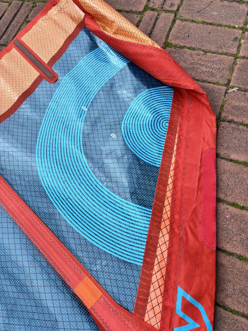 Una riparazione in tasca d’albero, piccolo taglio sistemato con Dacron adesivo nel ferzo tramato blu centrale e tasca della terza stecca ripresa con piccola riparazione. Interventi tutti eseguiti in veleria.